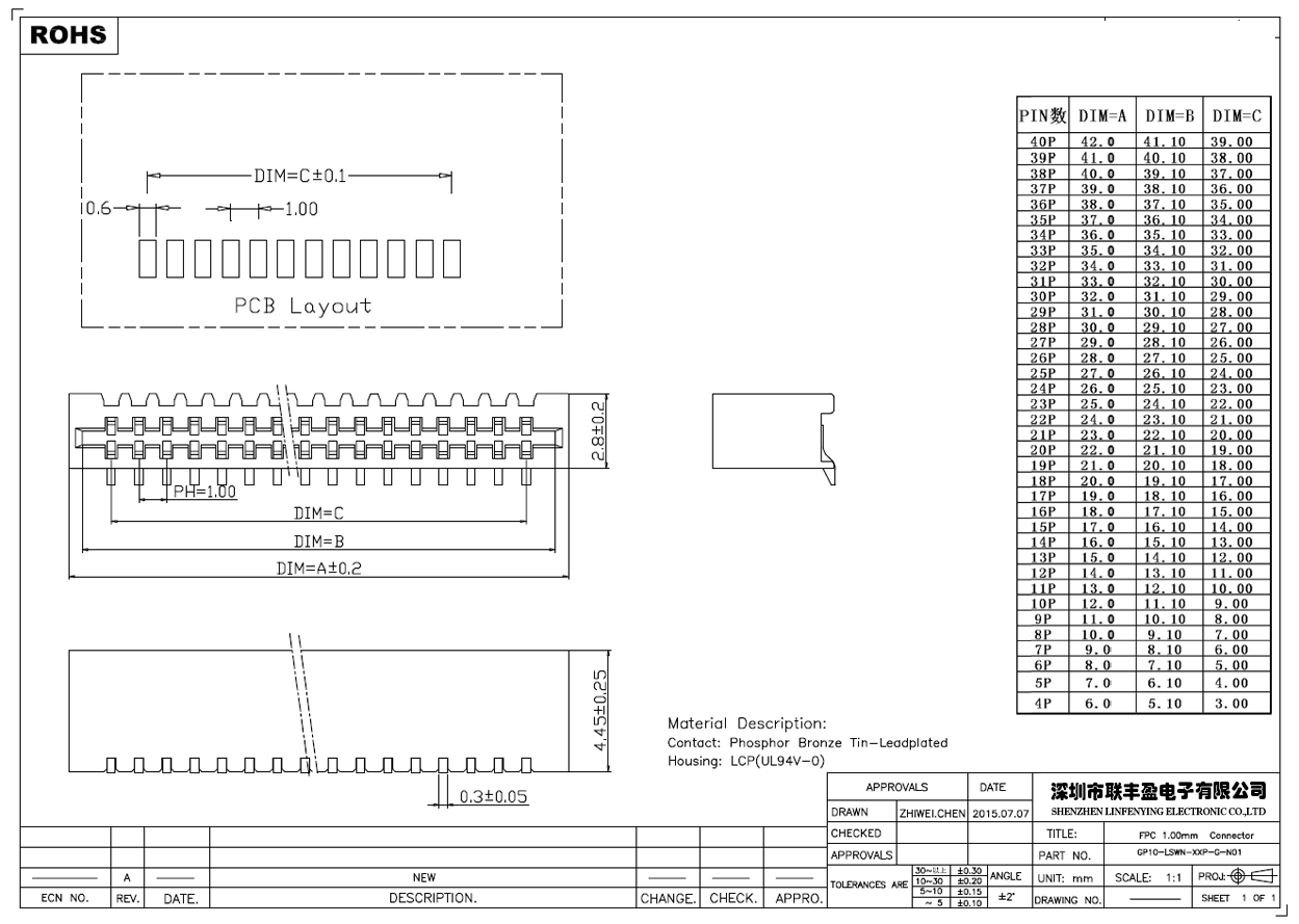 產(chǎn)品簡(jiǎn)介品名:FPC連接器規(guī)格:立式貼片/180°間距:1.0mm/單邊PIN數(shù):4P-40P高度:4.45mm