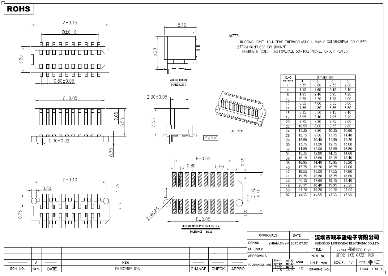 產(chǎn)品簡(jiǎn)介品名:0.8mm側(cè)插板對(duì)板連接器公座型號(hào):LFY02-100-GXXP-WOR規(guī)格:0.8mm間距/臥式90°PIN數(shù):4-52PIN塑膠顏色:米黃色