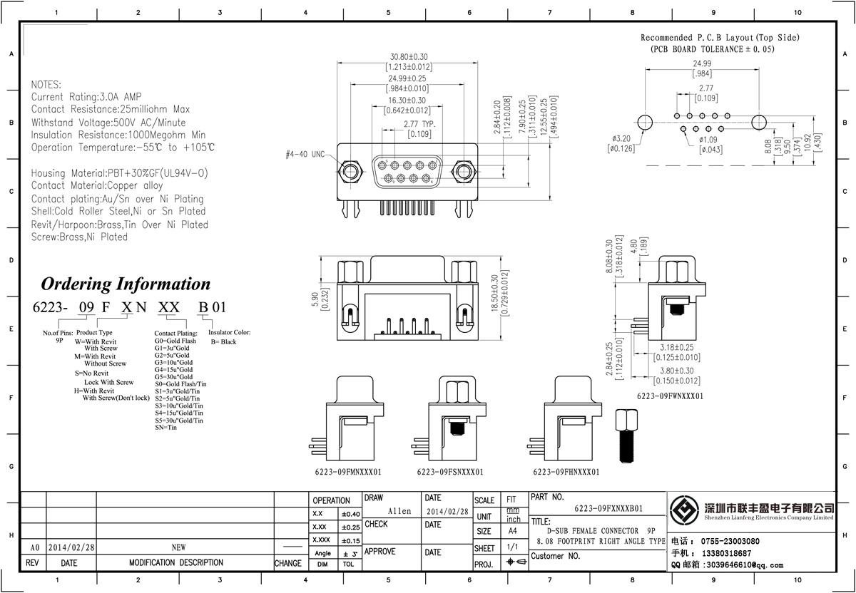 技術參數:額定電流:3.0amp電流電阻:20mΩ最大絕緣電阻:1000mΩMIN承受電壓:AC 500V /分鐘工作溫度:55oC + 105oC接觸材料:黃銅、磷青銅觸點電鍍金或錫鎳絕緣體材質:聚酯(UL94V-0)標準:PBT的+ 30%廣發(fā)殼:冷軋輥鋼,鍍鎳黃銅螺母:錫鎳板,