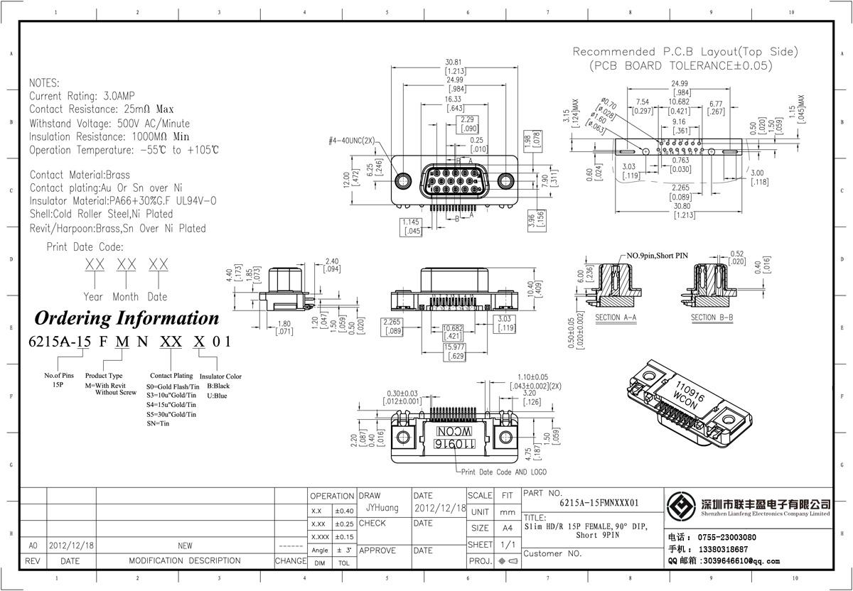 技術(shù)參數(shù):額定電流:3.0amp電流電阻:25mΩ最大絕緣電阻:1000mΩ min 承受電壓:AC 500V /分鐘工作溫度:55﹣℃+ 105℃接觸材料:黃銅觸點電鍍金或錫鎳絕緣體材質(zhì):聚酯(UL94V-0)標準:PBT的+ 30%廣發(fā)殼:冷軋輥鋼、鍍鎳黃銅,Revit /魚叉:錫鎳鍍螺絲材質(zhì):黃銅.