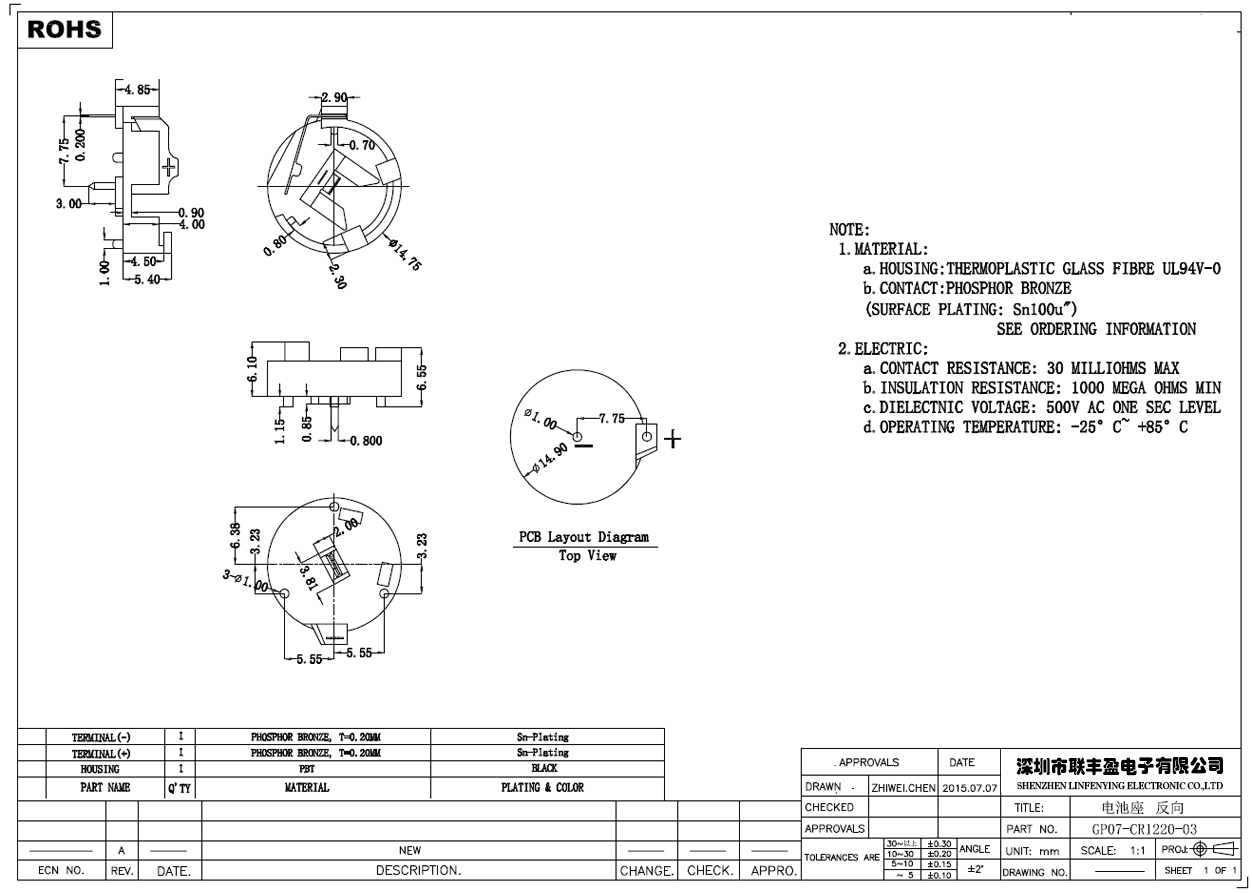 產(chǎn)品簡介品名:電池座產(chǎn)品型號:LFY07-CR1220-03電池型號:CR1220產(chǎn)品規(guī)格:DIP/插件式備注:黑色