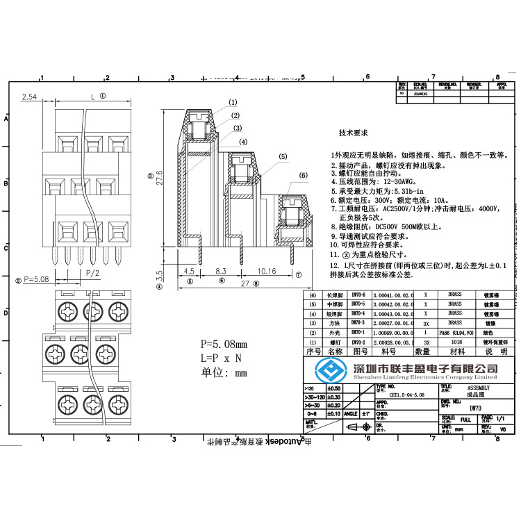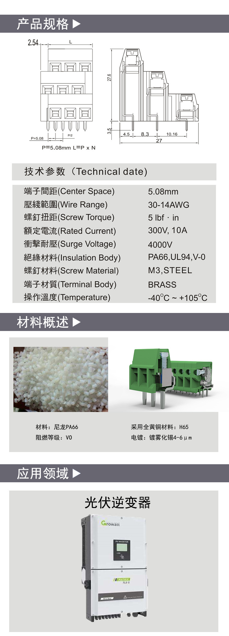 歐式PCB5.08三層接線端子間距螺釘式300V 15A 02P-03P;技術(shù)參數(shù)