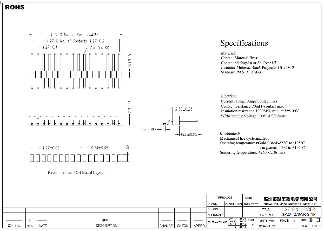 產(chǎn)品簡介品名:排針規(guī)格:貼片/臥式間距:1.27mmPIN數(shù):2-40PIN備注:排針系列