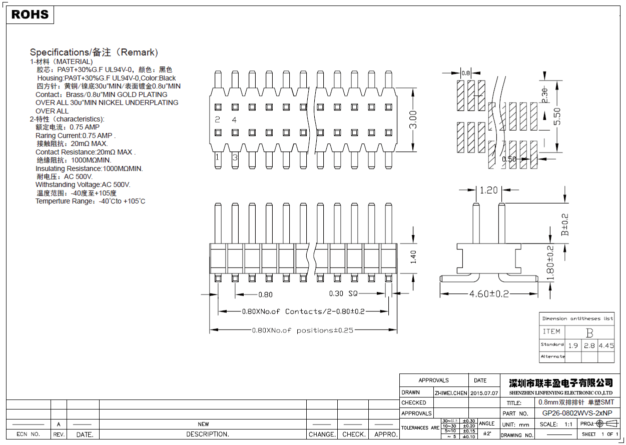 產(chǎn)品簡(jiǎn)介品名:排針規(guī)格:貼片/立式180°間距:0.80mmPIN數(shù):2-40PIN備注:排針系列