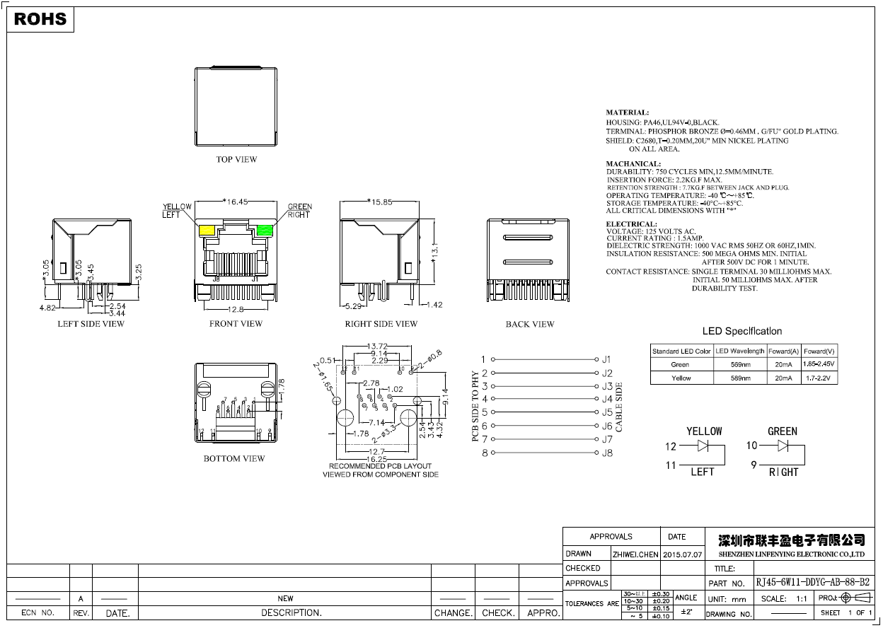 產(chǎn)品簡介品名:RJ45網(wǎng)絡(luò)連接器規(guī)格:臥式插件/90°外殼:帶屏蔽LED燈:黃/綠-其它顏色可定制塑膠顏色:黑色/其它顏色可定制