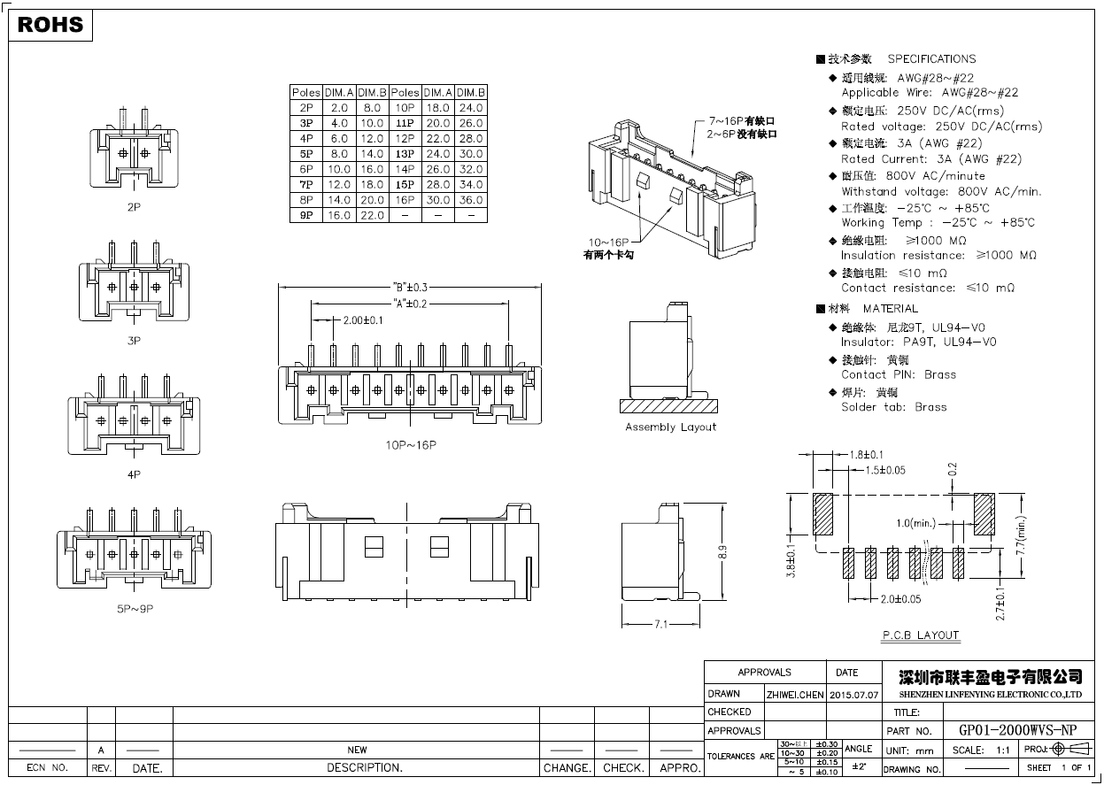 額定電流: 3A, AC/DC 額定電壓: 250V, AC/DC 使用溫度范圍: -25℃-+85℃ 接觸電阻: 10M max 絕緣電阻 : 1000M min 耐壓 : 800V AC/minute 產(chǎn)品應(yīng)用: 應(yīng)用于各類(lèi)室內(nèi)外LED智能照明燈條、TV背光模塊LED燈條、