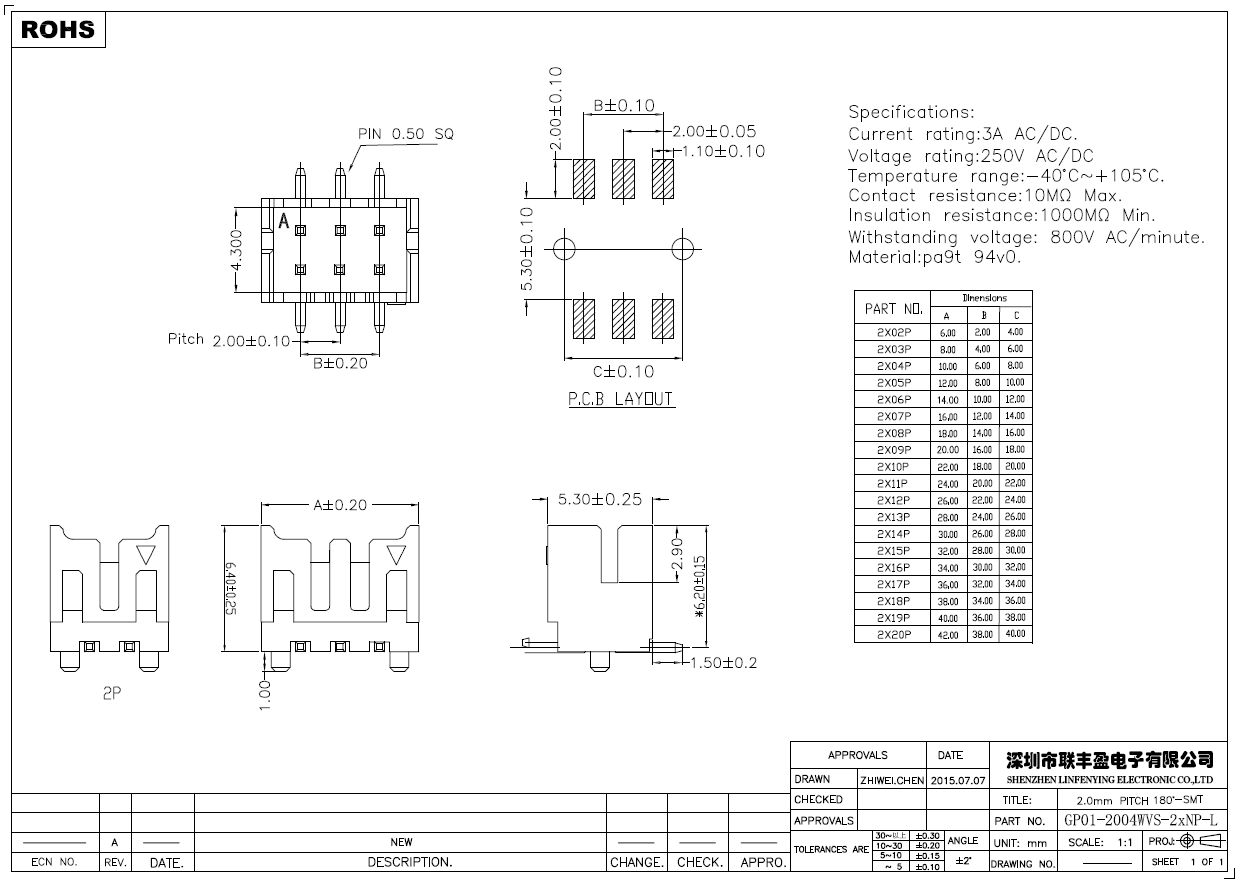 產(chǎn)品簡介品名:線對板連接器規(guī)格:立式/SMT180°間距:2.00mmPIN數(shù):4-40PIN