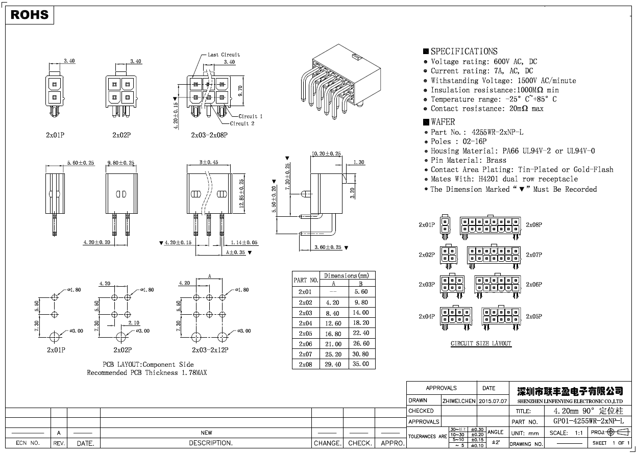產(chǎn)品簡介品名:線對板連接器規(guī)格:臥式帶柱/插件90°間距:4.20mmPIN數(shù):2-16PIN