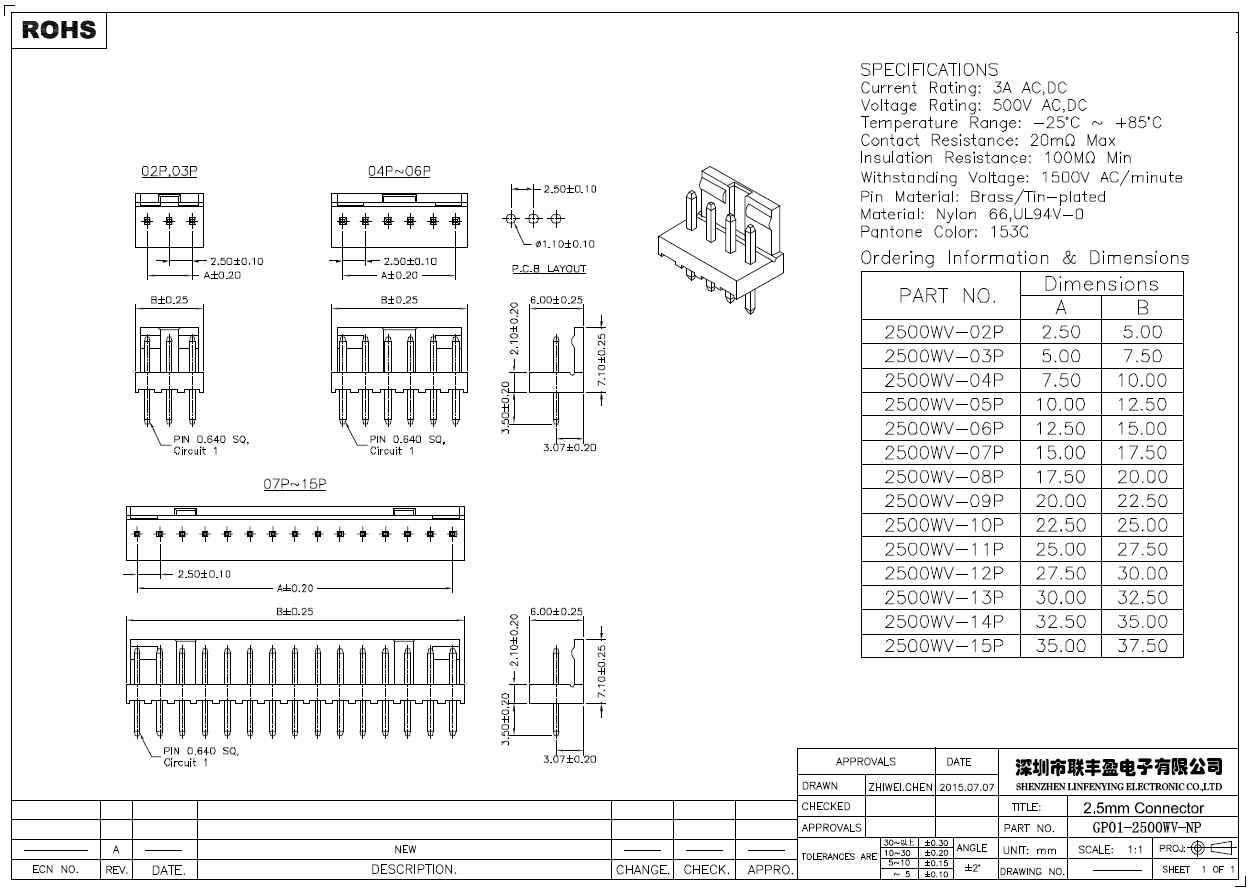 LFY01-2500WV-NP產(chǎn)品簡介品名:線對(duì)板連接器規(guī)格:直式/插件180°間距:2.50mmPIN數(shù):2-15PIN